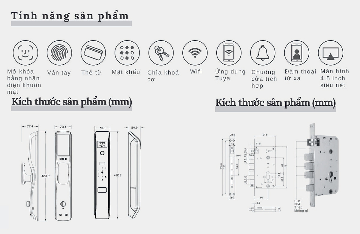 Phương thức mở khóa: Nhận diện khuôn mặt, vân tay, mật khẩu, thẻ từ, chìa khóa cơ, ứng dụng Tuya