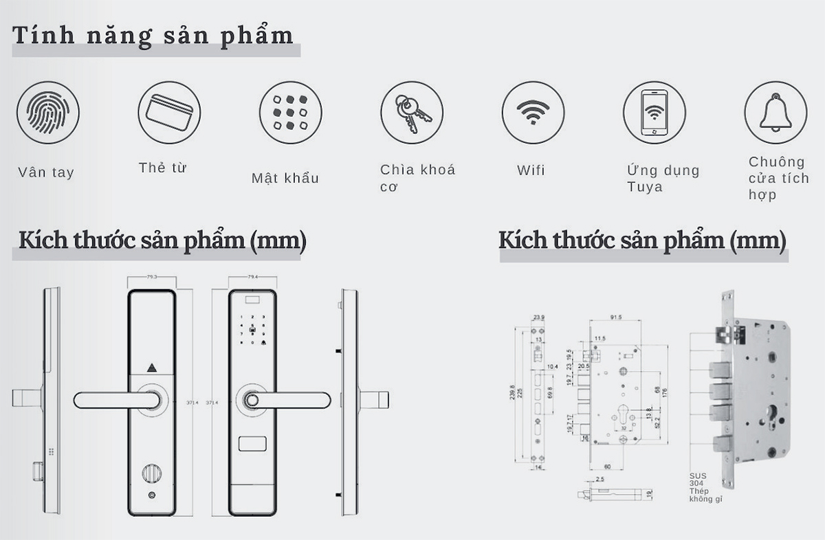 Phương thức mở khóa: Vân tay, mật khẩu, thẻ từ, chìa khóa cơ, ứng dụng Tuya